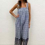 Now you don’t have to wish we made it in your size! The Aspen Jumper in dress blues with Indian block print bordering the cuff is flowy, fabulous, and flattering with gathers at the neck and cute wide straps. An invisible zipper and lining makes this easy on-and-off from beach to BBQ.