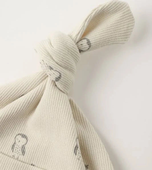 Our knotted baby gown is designed with lap sleeves and fold-over hand mitts to keep baby snug, paired with a matching knotted hat—all crafted from our soft, stretchy rib knit.
