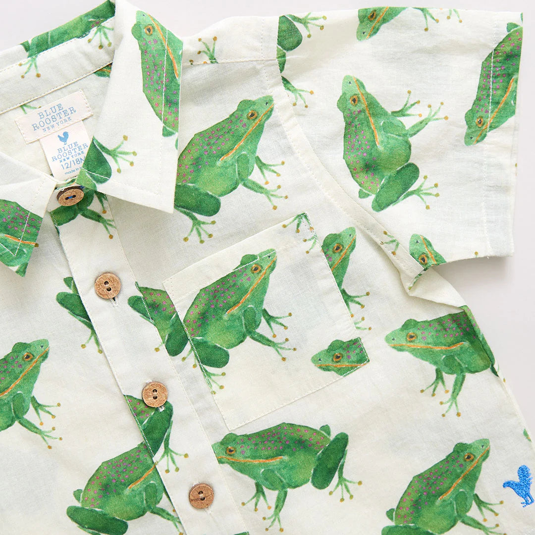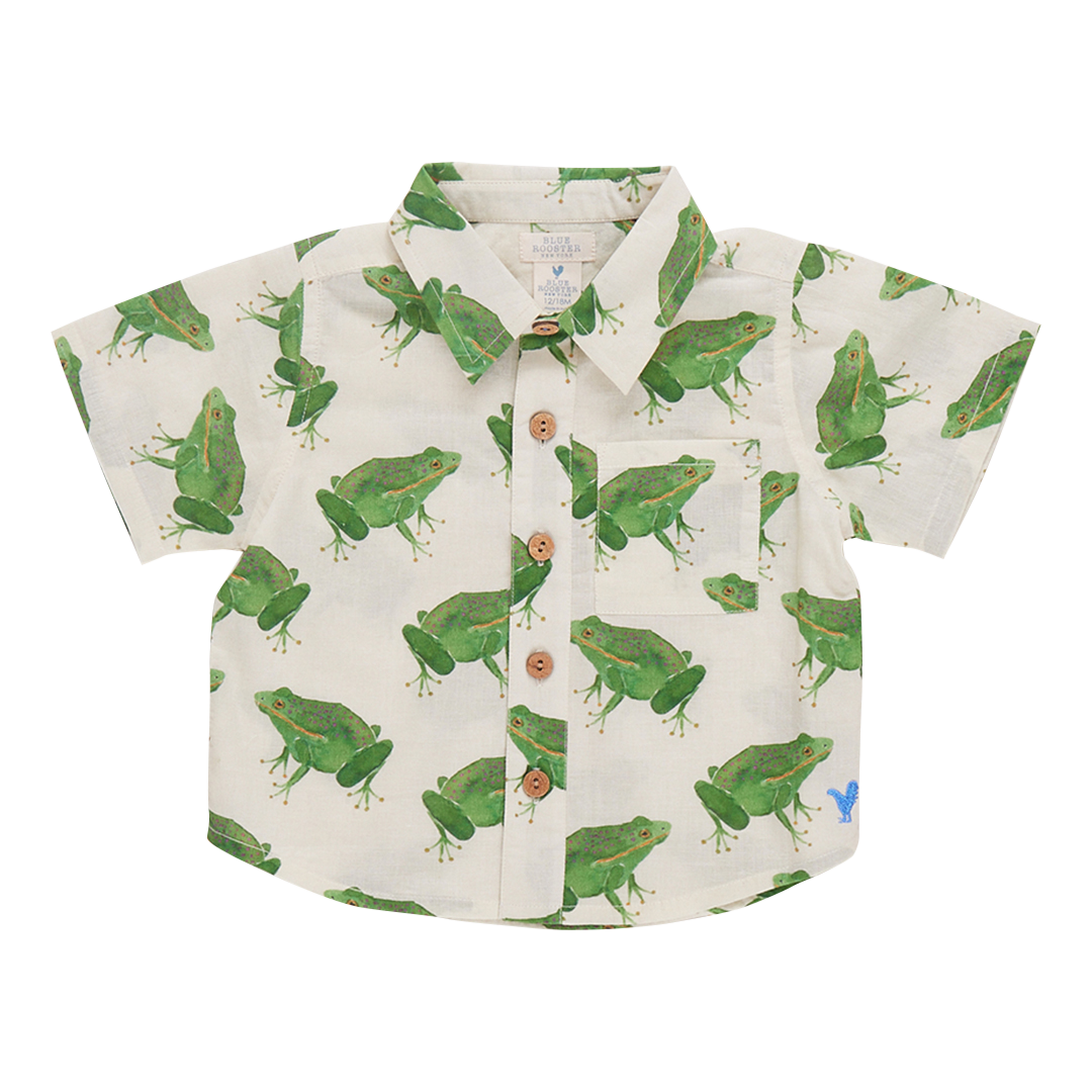 Hip Hop Hooray! Artist Jessica June Avrutin's handsome, speckled Frogs are poised and ready to leap to the next lily pad on our Boys Jack Shirt. Signature details on this collared, short sleeve classic include a faux coconut wood button down front and a pattern on pattern front chest pocket. Match back to Brother and Sister in our Baby Boys Jack Shirt, Girls Laura Dress and Baby Girls Auggie Bubble.