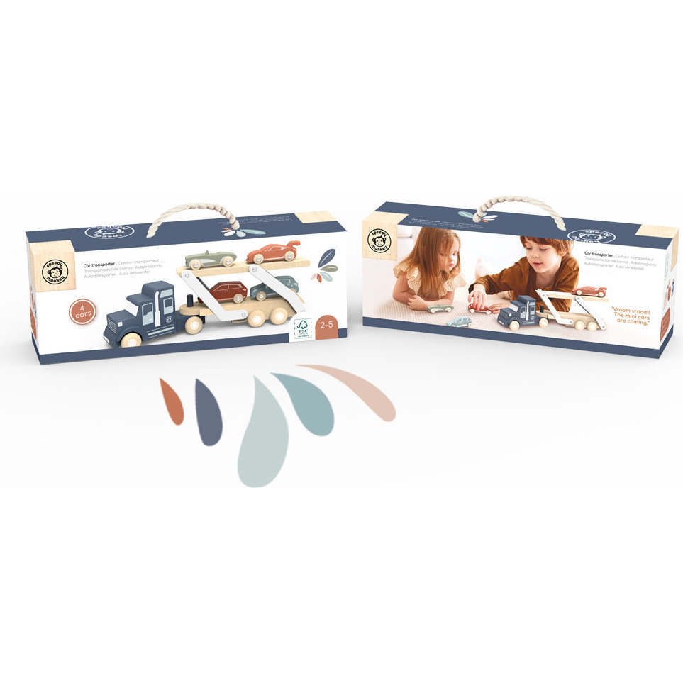 This wooden car transporter truck toy has a double-deck trailer. It easily converts for loading and unloading.