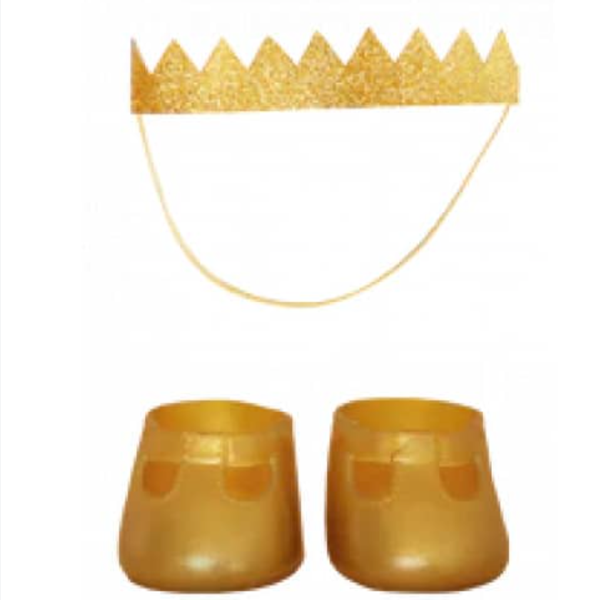 The Gold Sparkle Set comes with Biodegradable PVC gold sparkle shoes and a soft, glittery, PU fabric crown with an elastic chin strap.
