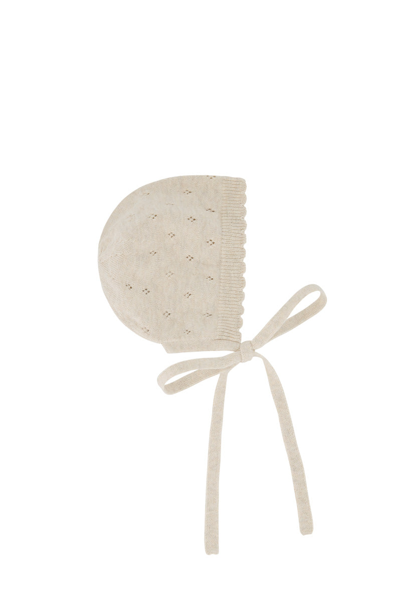 this knit bonnet will keep your baby girl cute + warm this winter. the knit detailing makes this extra sweet. adjustable tie for easy on + off.