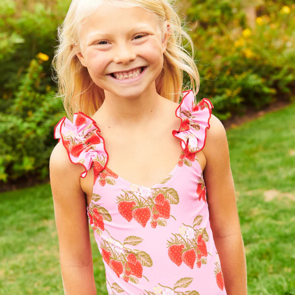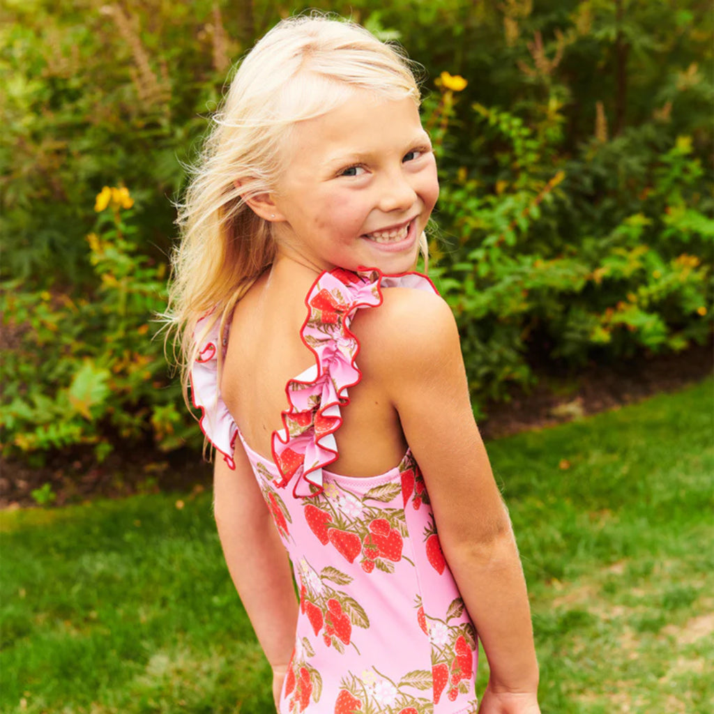 Berry Delightful! Vine ripened Wild Strawberries make a delicious statement our not so basic Girls Via Suit. A ruched ruffle strap with a unique purl stitch adds the perfect amount of sassy style to this practical one-piece.