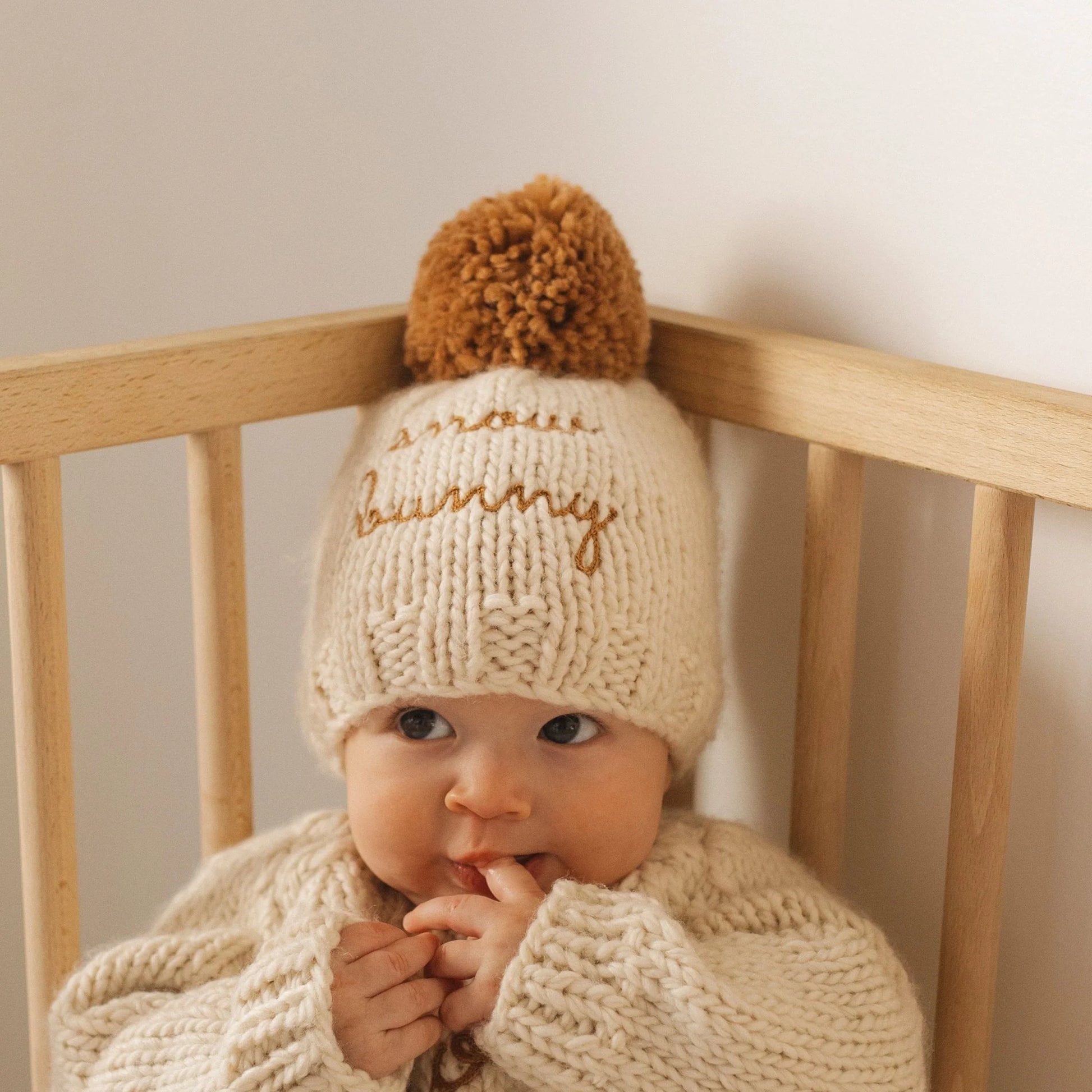 A handknit hat in chunky Natural hued yarn has 'snow bunny' embroided in Pecan Brown yarn on the front and is topped with a Pecan colored yarn pom pom. Available in sizes for babies to kids. Add our matching sweater to complete the look.