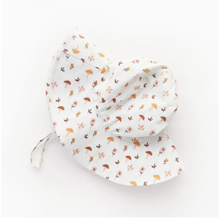 Perfect for the beach or everyday wear, this lightweight UPF 50+ sun hat is functional and cute. Made in an adorable fairy garden print with mushrooms and flowers, the hat has an adjustable chinstrap to keep hat in place, with a breakaway clasp for safety.