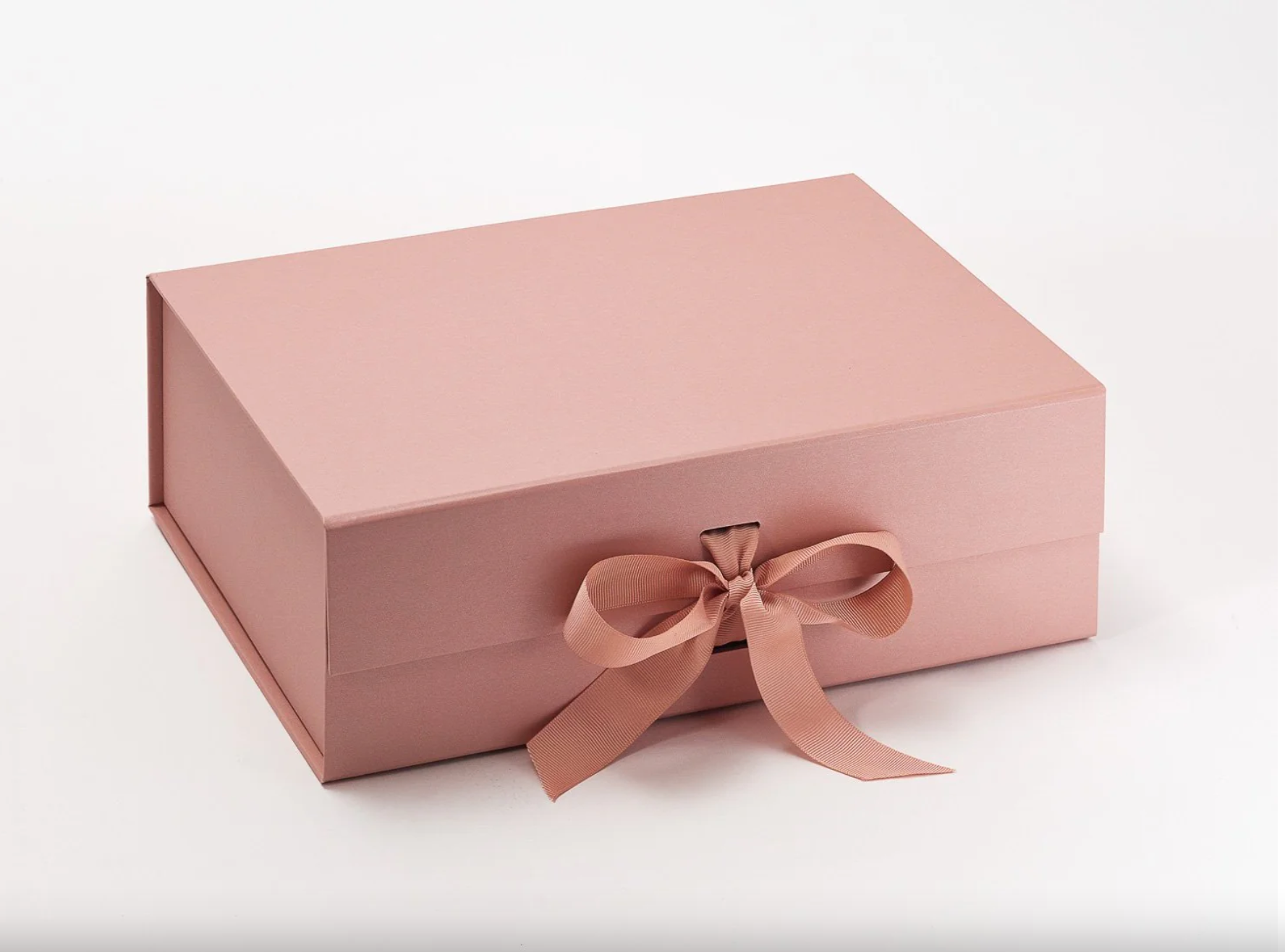 Rose Gold A4 Deep gift boxes with changeable ribbon are perfect luxury retail and display gift packaging. Ideal photography packaging and wedding or baby keepsake boxes.