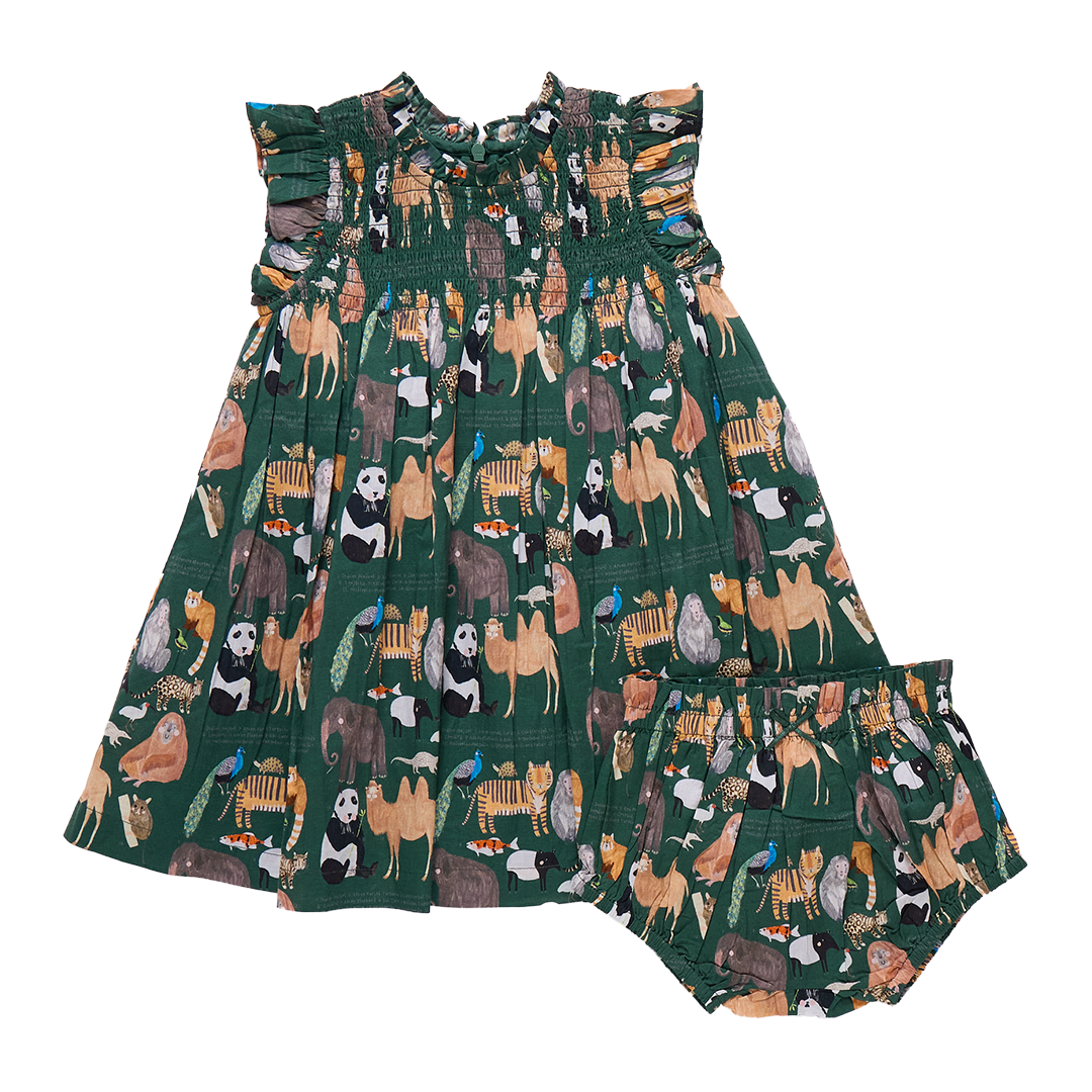 Artist Collab! Leave it to brilliant artist Darcie Olley to take us on an exotic adventure with our one-of-a-kind Animals of Asia print. Tigers, pandas, peacocks and more roam a forest green ground on our collection classic Baby Girls Stevie Dress Set. This much loved silohuette boasts a fluttery ruffled arm, subtle ruffle at the neck and vintage inspired smocking at the chest and a matching elastic waist diaper cover with a fixed pink satin bow at the waist. Match back to brother and sister in our Boys and Baby Boys Jack Shirt, and Girls Stevie Dress.