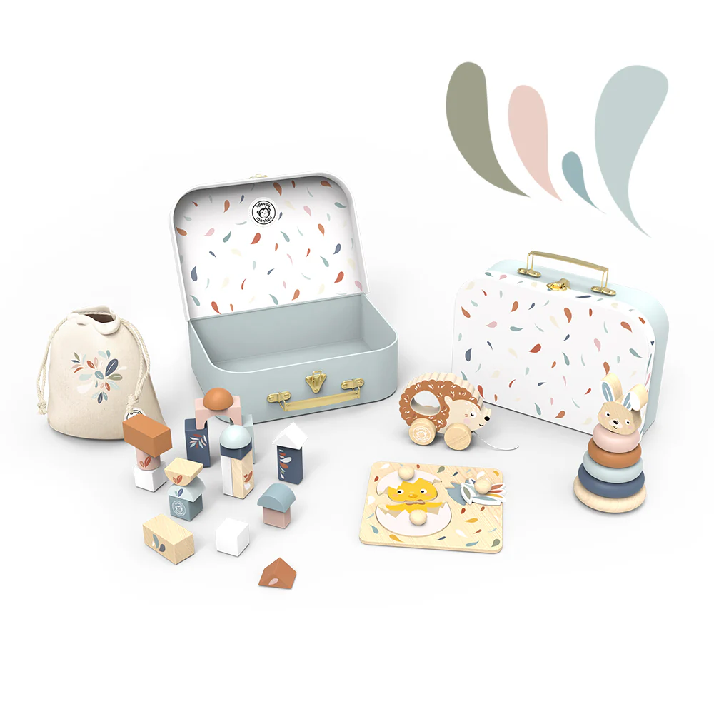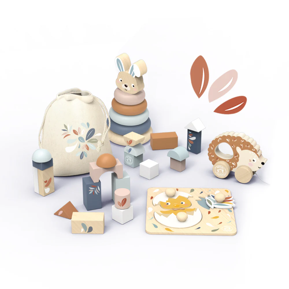 This toy box is not only visually appealing but also functional, providing a safe and spacious storage solution for your child's favorite toys. Made from high-quality wood, it ensures durability and longevity. Includes buildings blocks with fabric pouch, stacking rabbit, chick puzzle and pull-along hedgehog. With easy care instructions of cleaning only with a damp cloth, this toy box is convenient for parents to maintain. Avoiding detergents will help preserve the vibrant colors and quality of the wood. Add a touch of fun and organization to your child's play area with the My First Toy Box. A perfect addition to any nursery or playroom!
